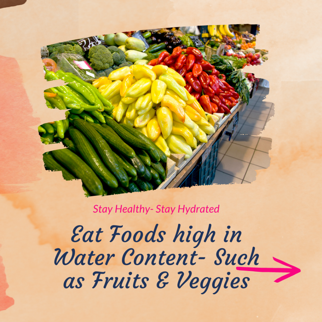 Eat foods high in water content such as fruits & veggies such as watermelon, cantaloupe, cucumber, tomato, lettuce, zucchini etc..