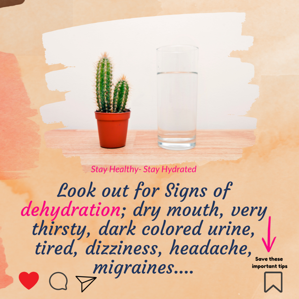Look out for signs of dehydration such as; dry mouth, very thirsty, dark colored urine, tired , dizziness, headache, nausea etc…